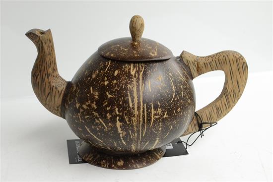 A NOVELTY TEAPOT FORMED FROM A COCONUT, (HANDLE REPAIRED), 15CM HIGH