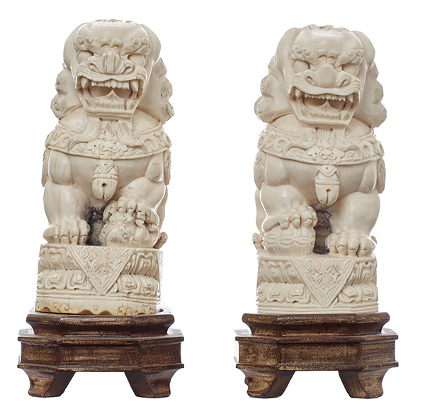 A PAIR OF EARLY 20TH CENTURY IVORY TEMPLE LIONS
