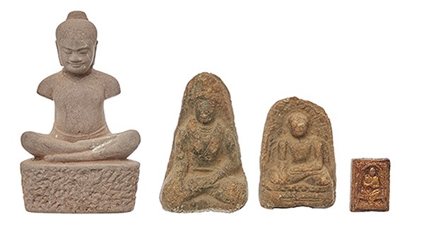 FOUR CAMBODIAN CARVED STONE FIGURES AND A SHRINE