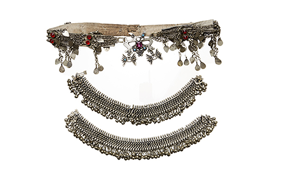 Each decorative anklet set with articulated bell drops to a fabric backing, a similarly stylised necklace with decorative metal drops, highlighted by red paste stones, to a centre plaque with pink paste and turquoise beads. Together with a pair rings set with coral beads above decorative metal work. (5)