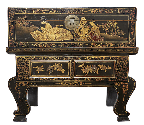 The lift top chest positioned on a two drawer base with ring handles. Red and gilt decoration depicting an erotic scene and scholars rock. 99 x 48 x 92cm.