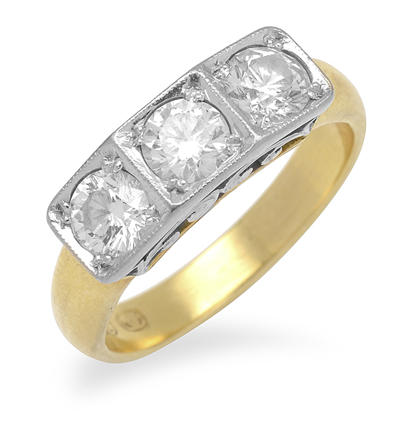 Comprising three round brilliant cut diamonds totalling 1.15cts, mounted in 18ct gold, ring size O.