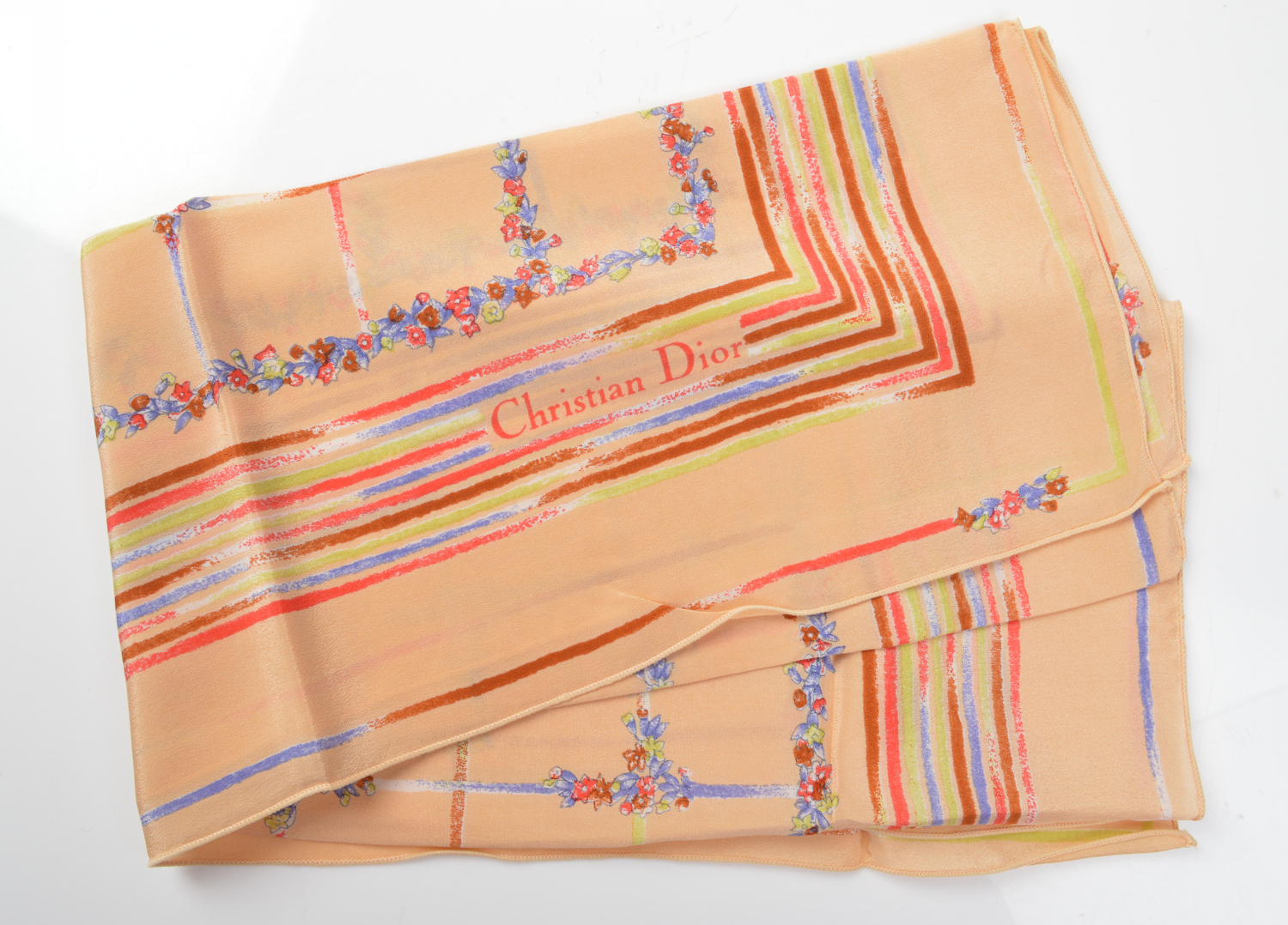 Styled with a multi coloured linear and floral design, on a peach background, 56cm square, with box.