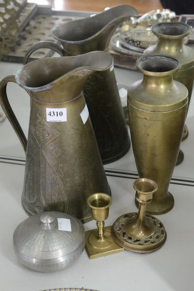 A GROUP OF METAL ITEMS, INCL. NEAUVEAU BRASS JUG, PEWTER CANNISTER, CANDLESTICKS, ETC