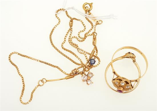 TWO RINGS STAMPED 18CT AND 14CT GOLD TOGETHER WITH A NECKLACE STAMPED 14CT GOLD