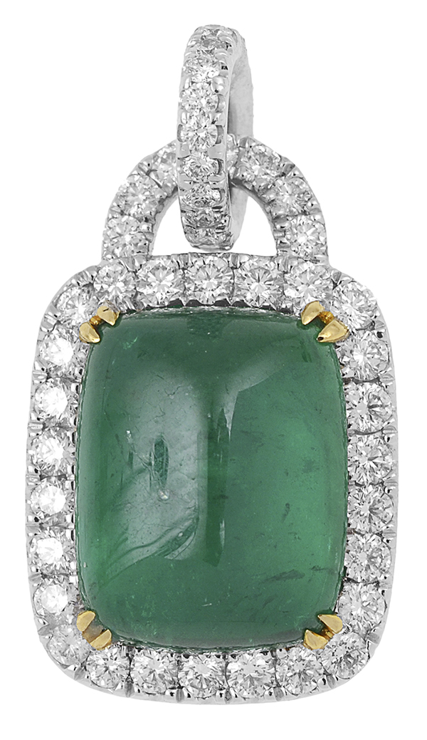 Comprising a ring, earrings and pendant, the ring set with a fancy cushion shaped emerald cut en cabochon of 6.67cts, flanked by two demi-lune shoulder diamonds totalling 0.90cts, ring size L, the earrings each set with an emerald weighing 3.38cts, surrounded by round brilliant cut diamonds and suspended from a diamond hoop, the pendant of conforming design set with an emerald of 4.43cts, all set in platinum and 18ct white gold.