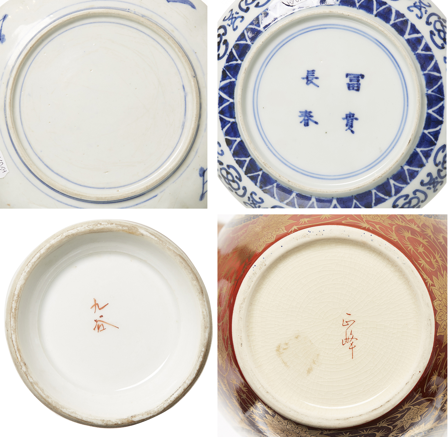 Four character mark to underside of export plate, both vases signed, vases 12.5 and 18cm high, plates 15 and 18cm diameter (4)