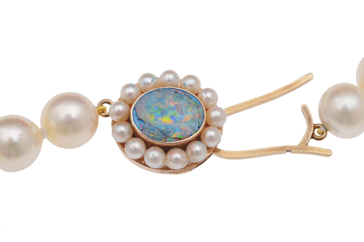 Pearls display fine lustre and are well matched. A few minor marks to skin. Opal doublet is cracked.