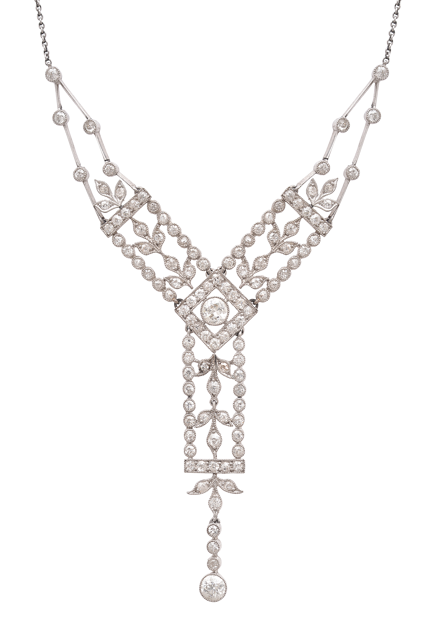 Of pierced design, the geometric panel with floriate decoration grain set throughout with old European cut diamonds, having two principal diamonds totalling 0.62cts, to a fine trace chain, all in platinum, total length 430mm.