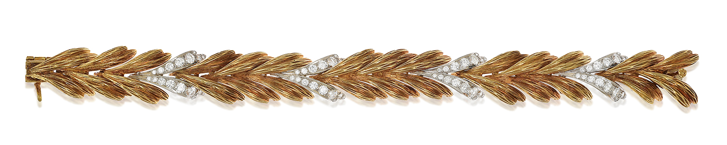 Designed as textured gold leaves interspaced with four diamond set leaves totalling 3.00cts, mounted in 18ct gold, total length 195mm.