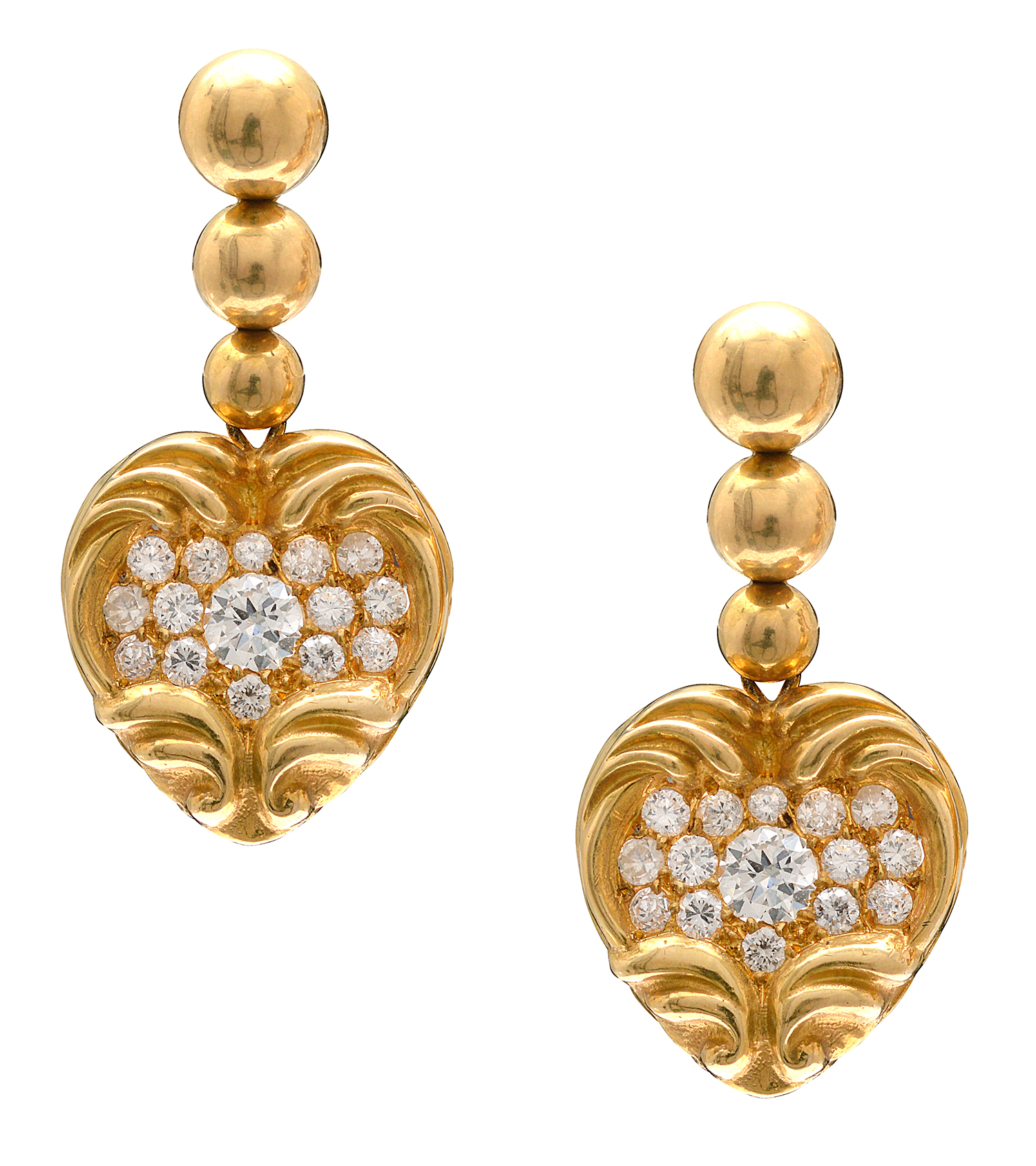 The fancy link collar having floral decoration crafted in 18ct gold, finished with a chased heart shaped padlock set with old European cut diamonds totalling 1.00cts, mounted in 15ct gold, together with a pair of later conforming diamond drop earrings mounted in 18ct gold to screw back fittings.