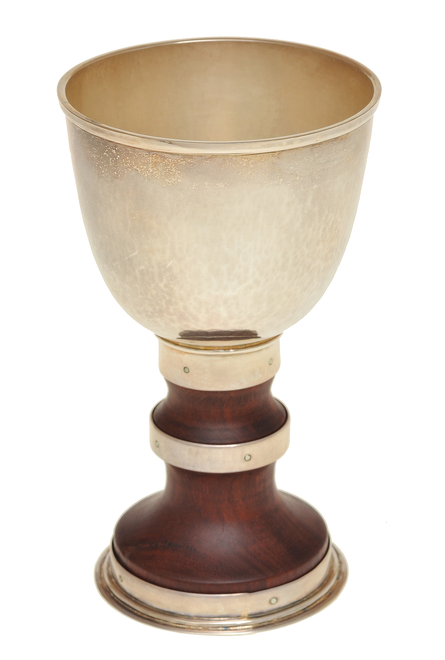 the hand raised silver applied over turned and polished red gum timber stem, hallmarked 925 along with the markers initials, each goblet 14cm high