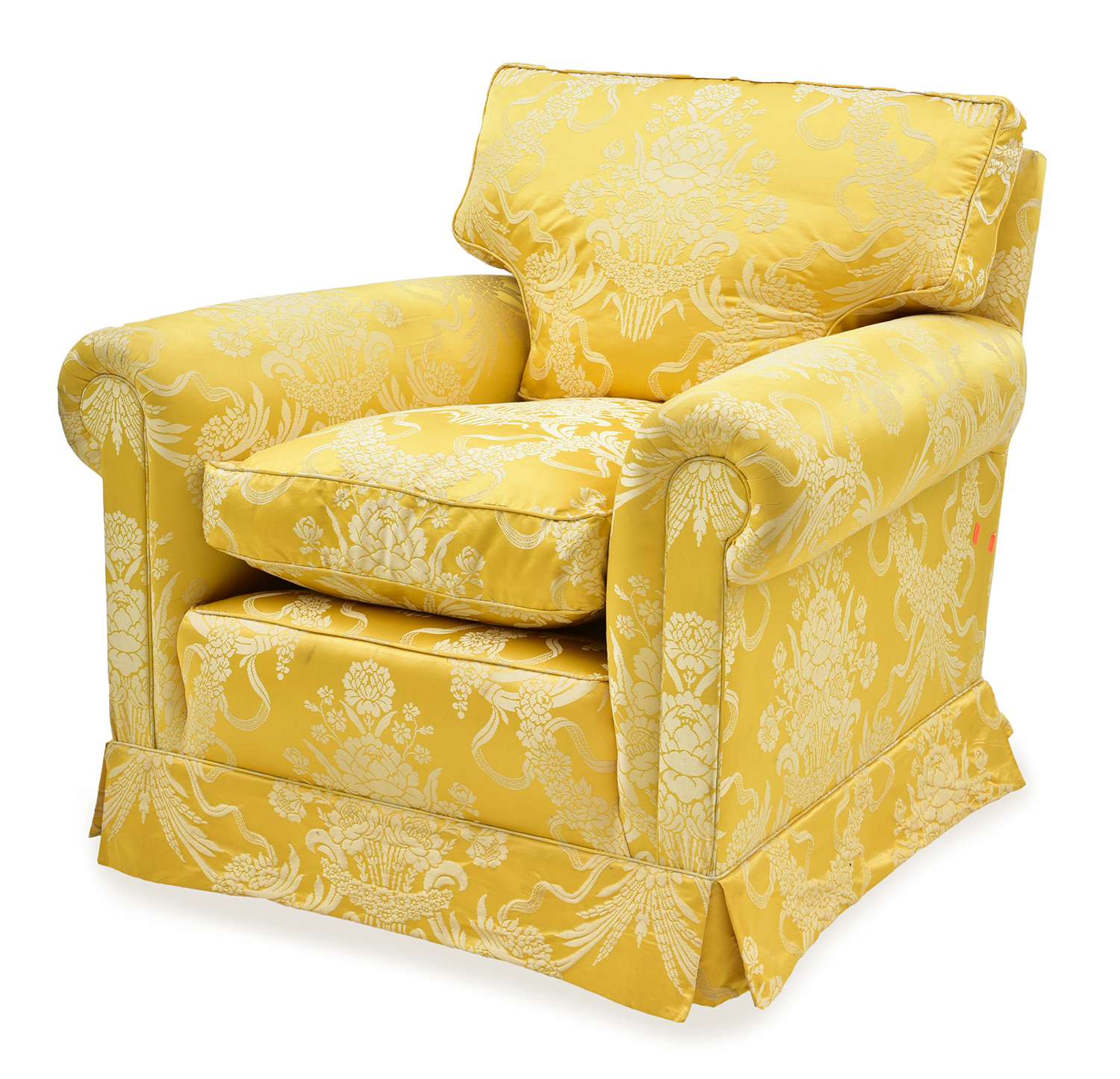 comprising a three seat sofa and a pair of club armchairs, each upholstered in a cream floral patterned silk on a vibrant yellow ground,