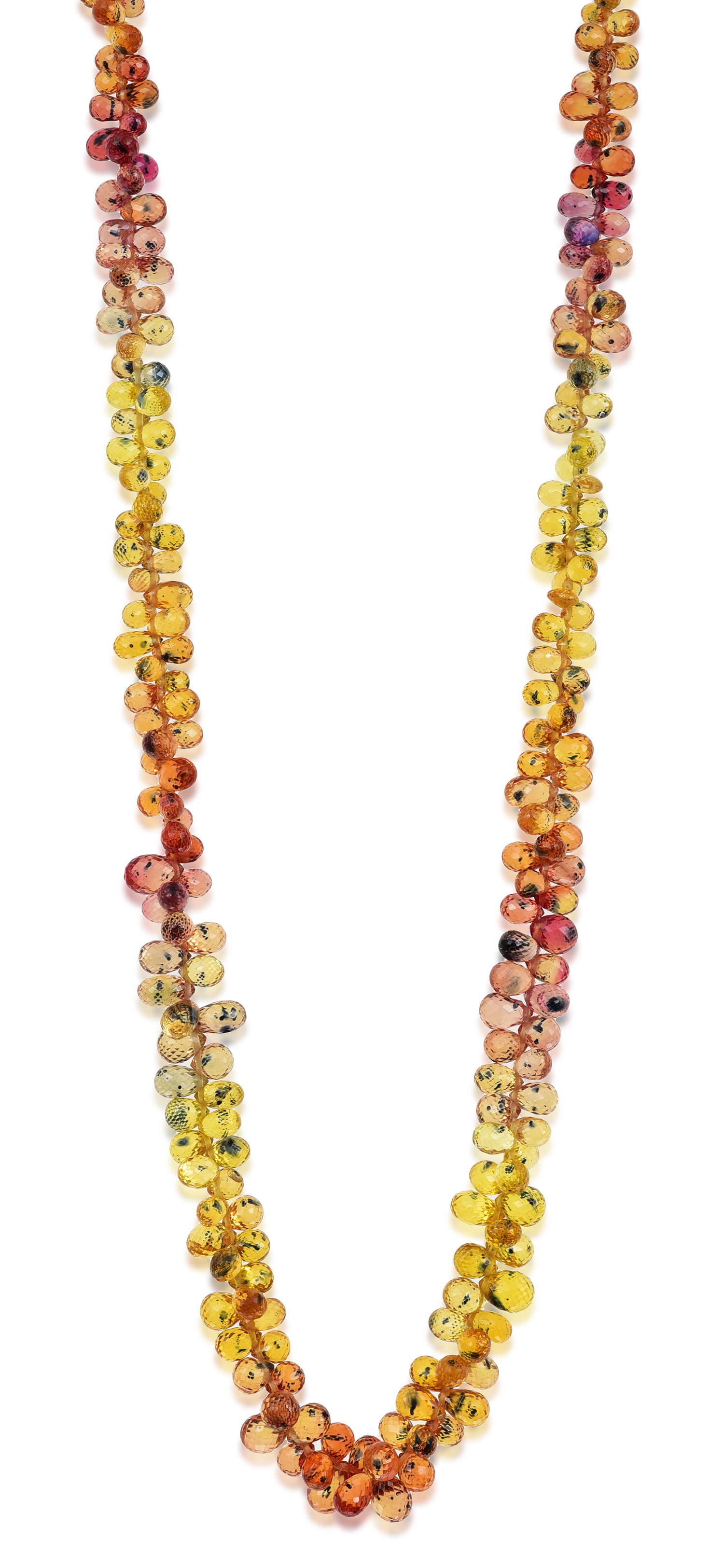 Comprising multi-coloured briolette cut sapphire necklace of 152cts, total length 440mm, with a pair of conforming drop earrings, mounted in 18ct gold, to shepherd hook fittings.