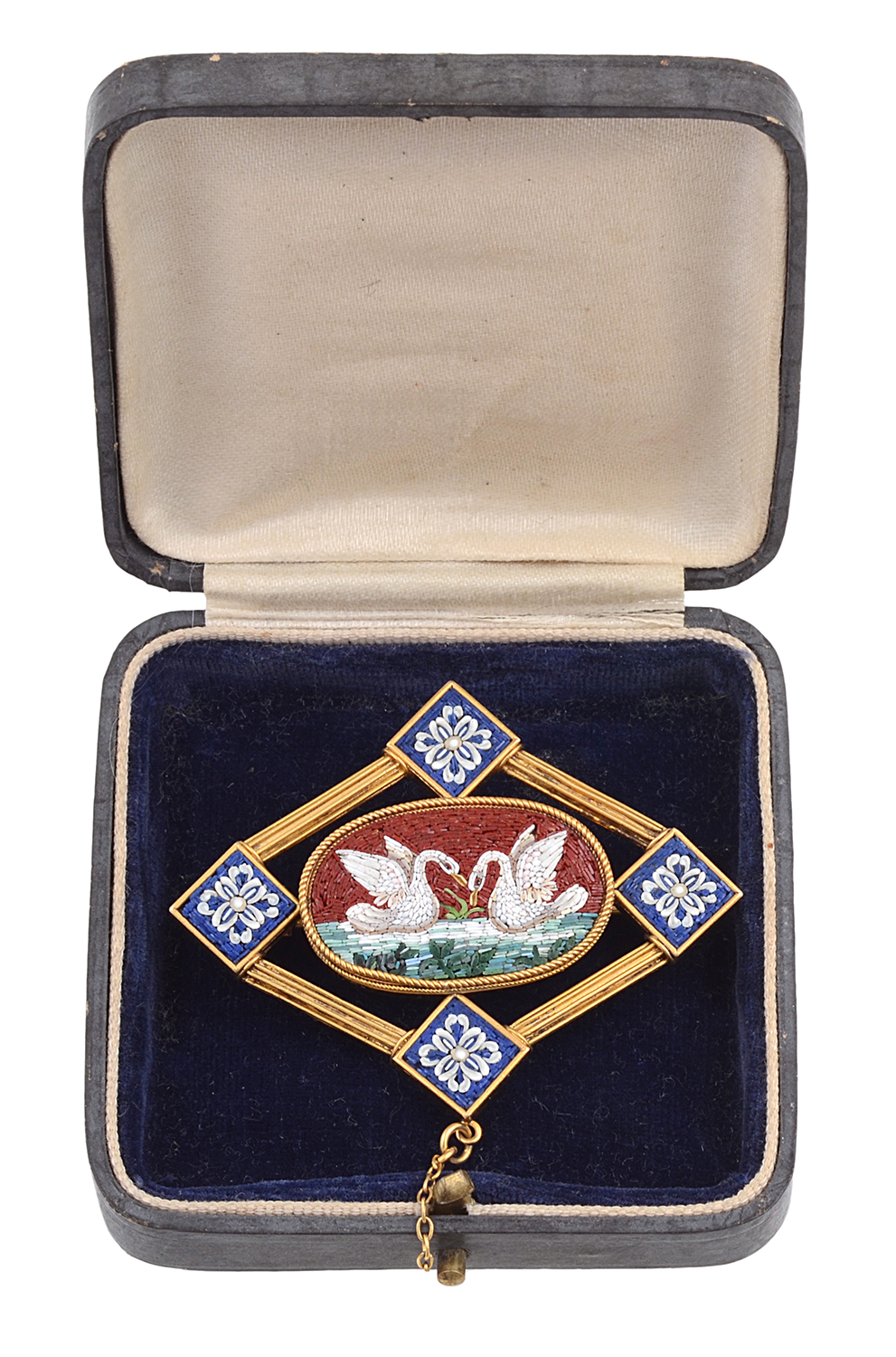 The pierced lozenge shaped panel having a central oval section depicting two white swans on a lake amongst bulrushes with a red skyline, offset by four diamond shaped panels set with white flowers on a blue background, stamped verso with crossed keys, all mounted in 18ct gold, circa 1860.
