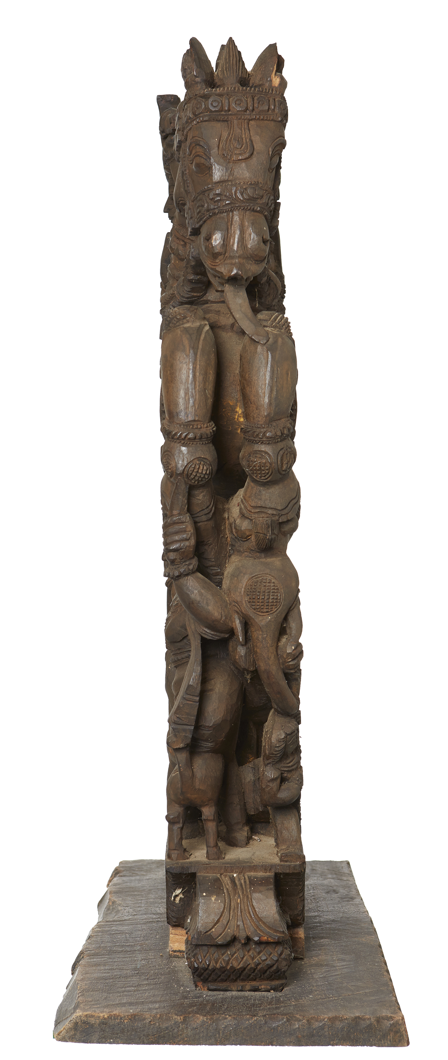Depicting a Maharaja in battle on horseback, carved to both sides, 38 width x 13 depth x 79cm height (excluding base)