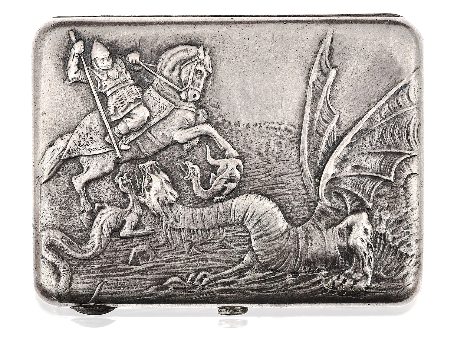 The rectangular hinged case having elaborate chased decoration depicting St George and the dragon, Russian marks, total length 110mm.