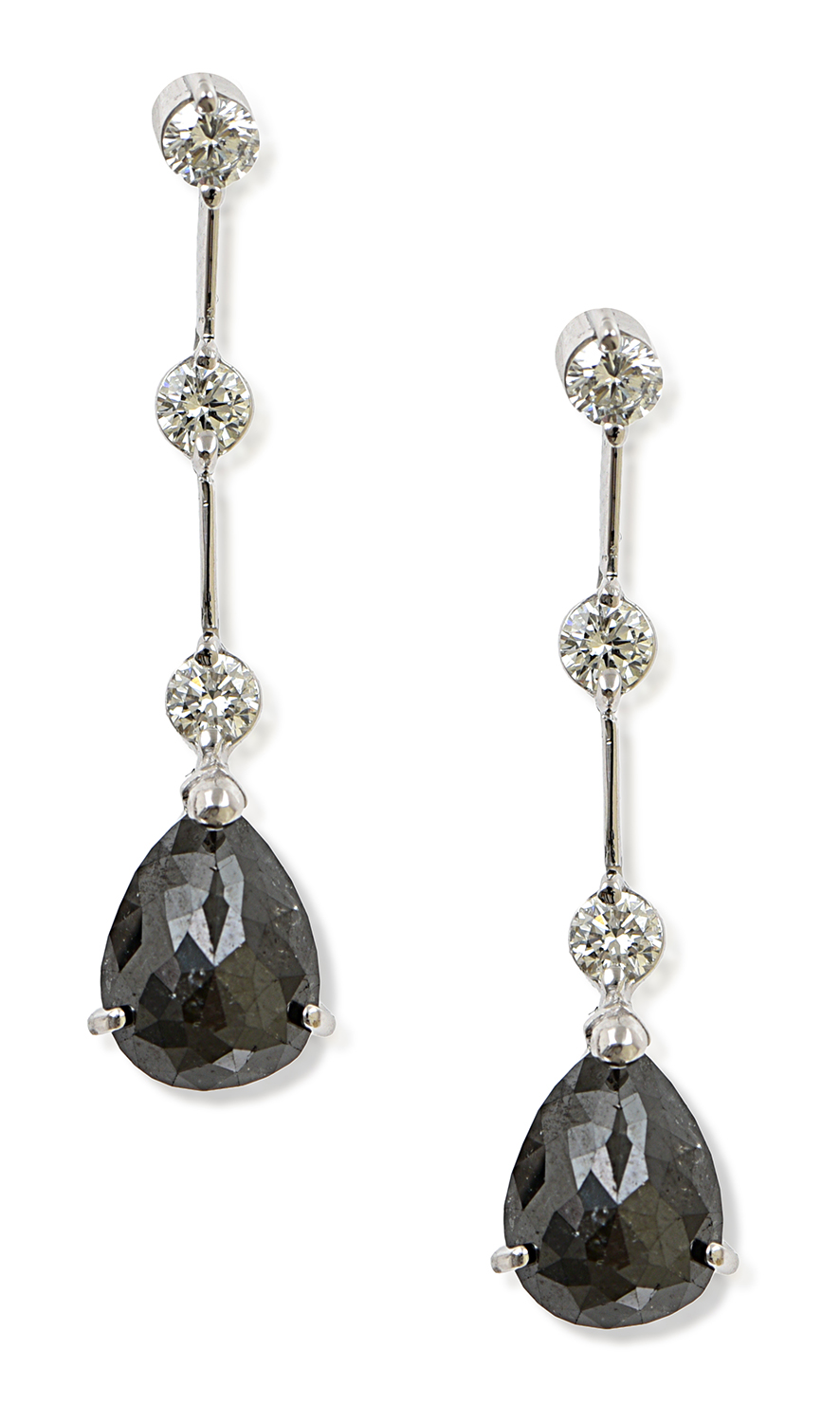 Each piece featuring a tear drop fancy cut black diamond surmounted by three round brilliant cut diamonds with knife edge bars, all mounted in 18ct white gold.