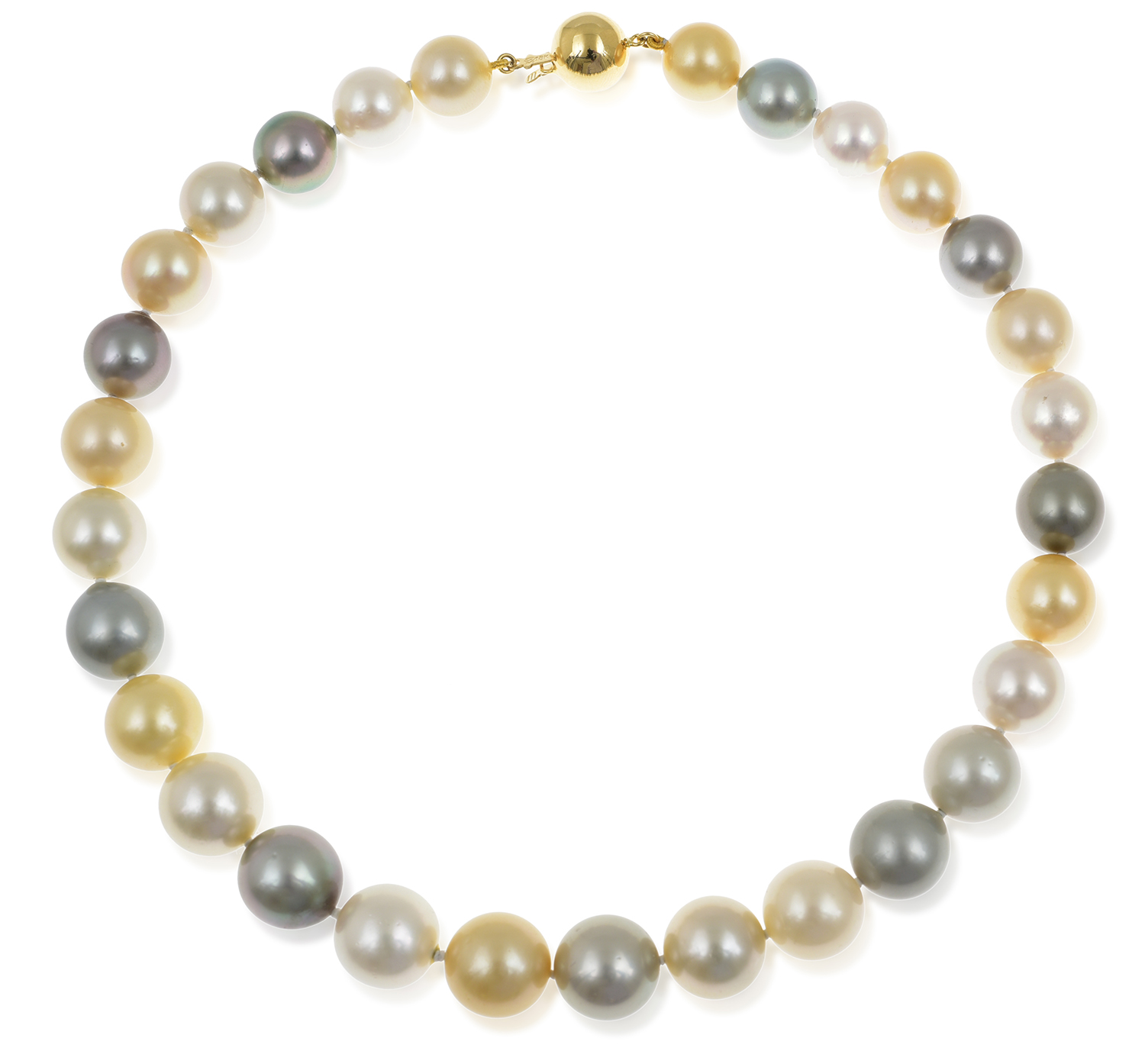 The necklace comprising twenty nine round pearls of grey, white and golden hues measuring 12.0mm to 14.5mm, to an 18ct gold ball clasp, total length 410mm, together with a conforming bracelet with pearls measuring 11.0mm, total length 180mm.