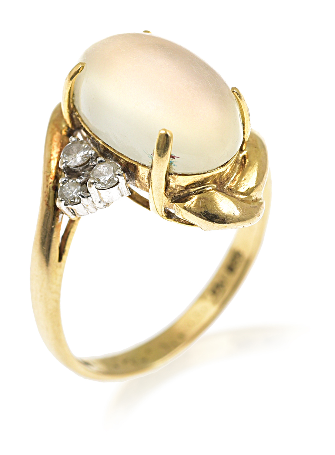 Comprising a pair of earrings and a ring, each earring set with an oval moonstone cut en cabochon in a reeded frame, the ring of conforming design with diamond detail set to the shoulders, mounted in 14ct gold, ring size N.