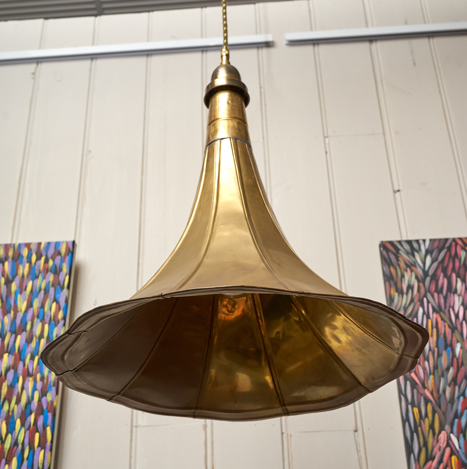 A PAIR OF 1930s GRAMAPHONE HORNS CONVERTED TO CEILING LIGHTS