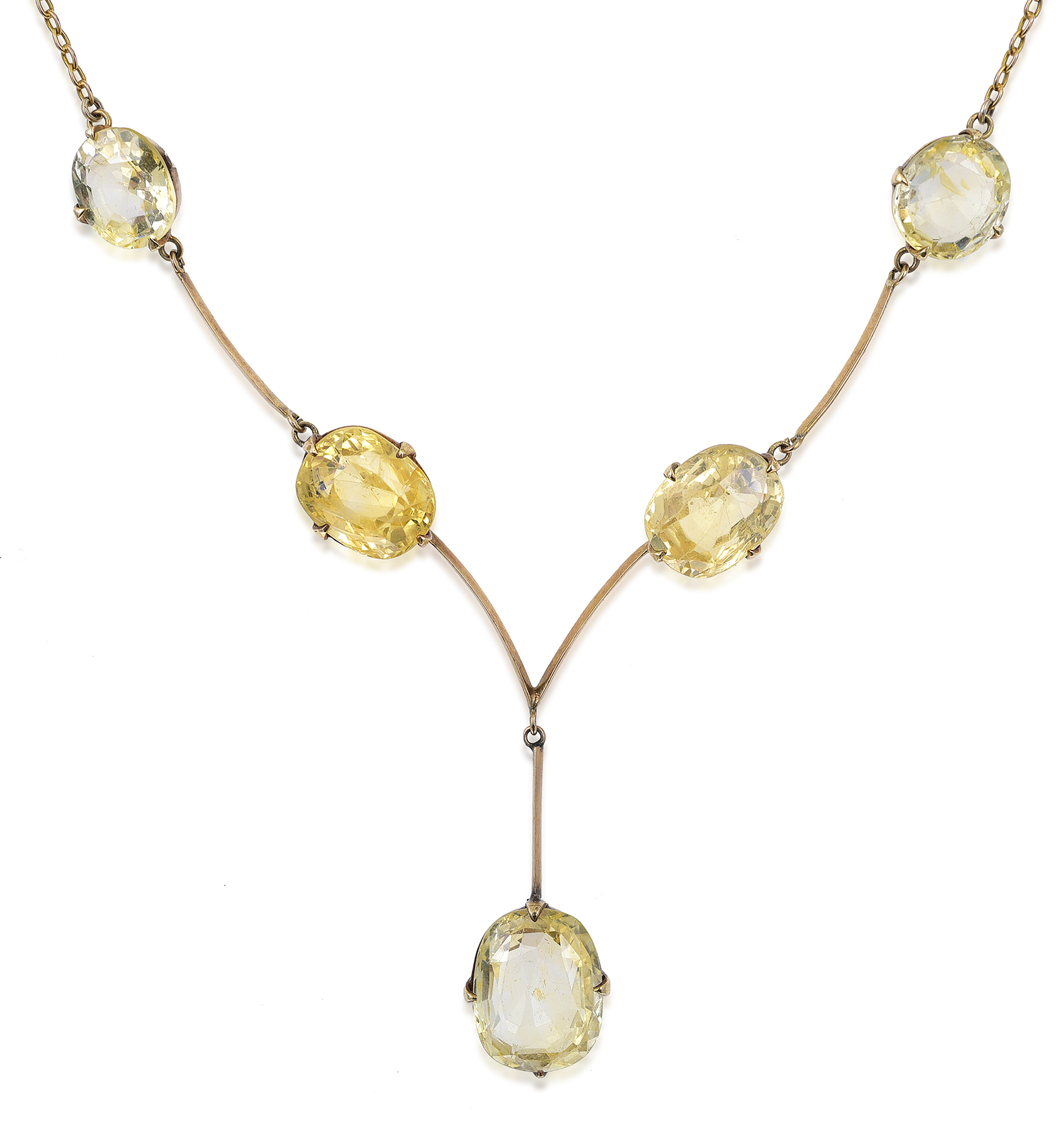 In very good condition. Earrings have screw back fittings. All gems secure in settings. Minor bends and wear to links in necklace and earrings and some scratching to gold surfaces. Acid testeds as 14ct gold. Comes with addition damaged yellow sapphire ring and seed pearl ring. Total weight 20.24gms