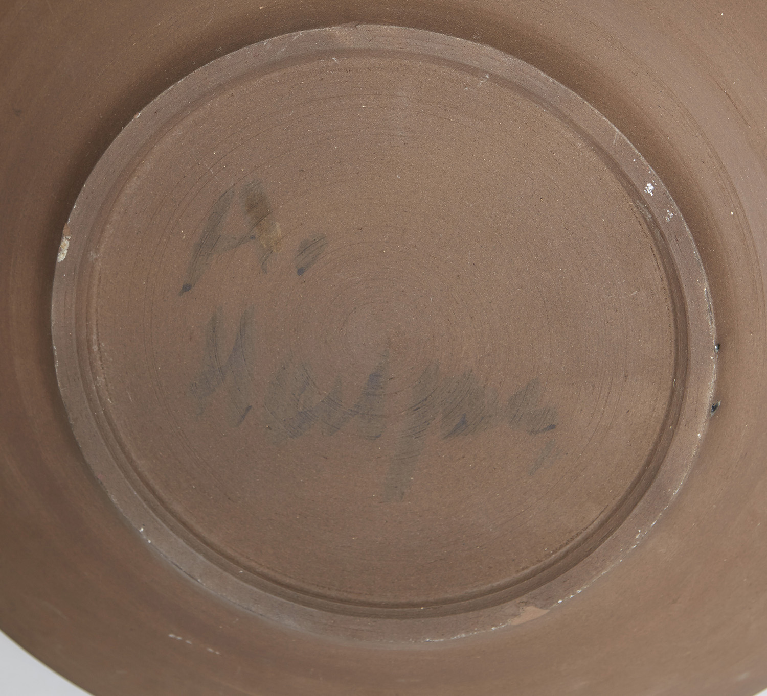 With resist abstract design on a green high fired glaze, illegibly signed, 42.5cm diameter
