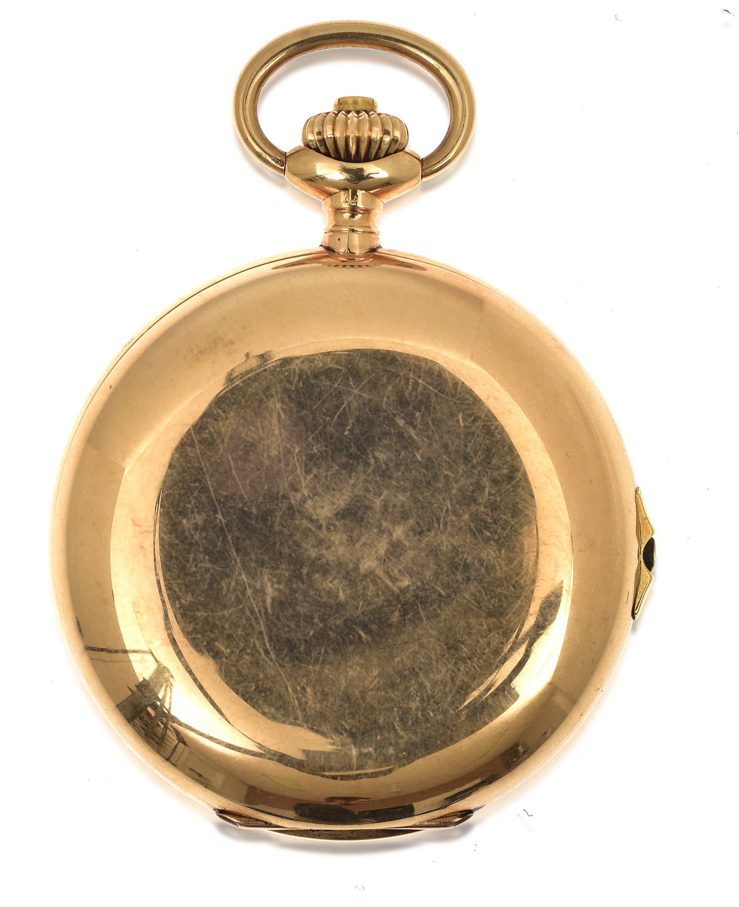 Crown wind lever set movement, circular white dial with black Arabic numerals, subsidiary seconds dial at six, signed case, dial and movement, 14ct gold case, case number 0968523, 55mm diameter.