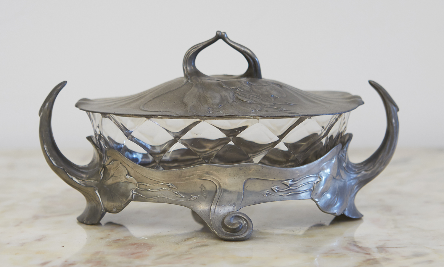 AN ART NOUVEAU PEWTER MOUNTED GLASS DISH BY ORVIT AND AUSTRIAN SILVER BOX