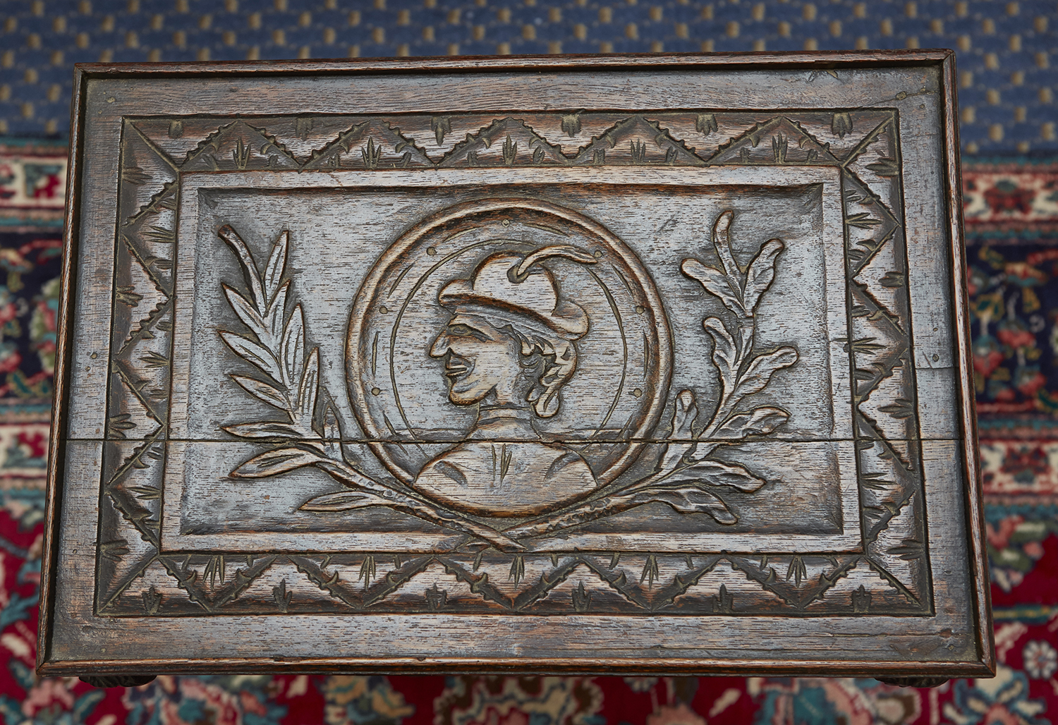 The top with inset portrait panel above horse mask mounts and scroll carved mouldings, 19th century with 16th century elements 48 width x 33 depth x 66cm height