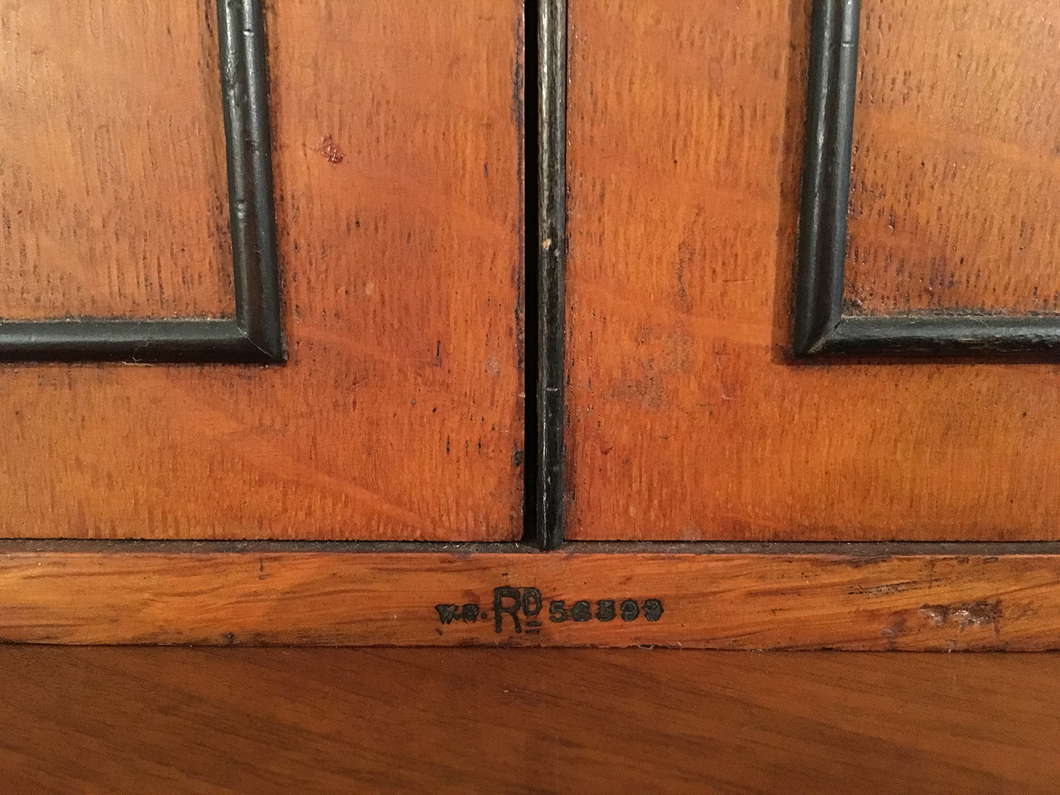 With gilded Royal crest embellished armorial and ebonised stringing and mounts opening to brass handled drawers, paper label and RD mark, 24 width x 18 depth x 24cm height