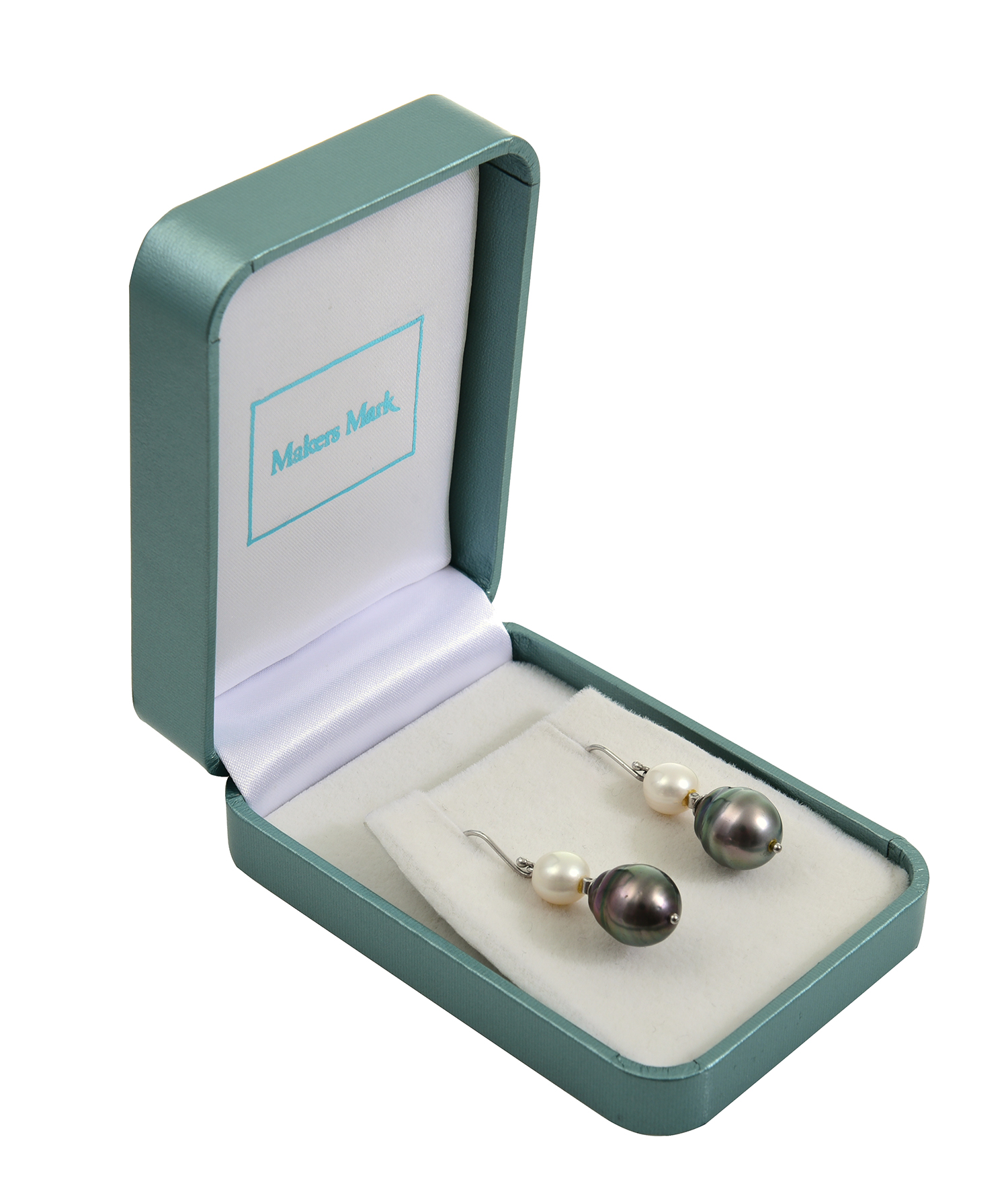 Each featuring a baroque Tahitian pearl of peacock hues measuring 12.4mm, surmounted by a round brilliant cut diamond and a white freshwater pearl, mounted in 18ct white gold, boxed.