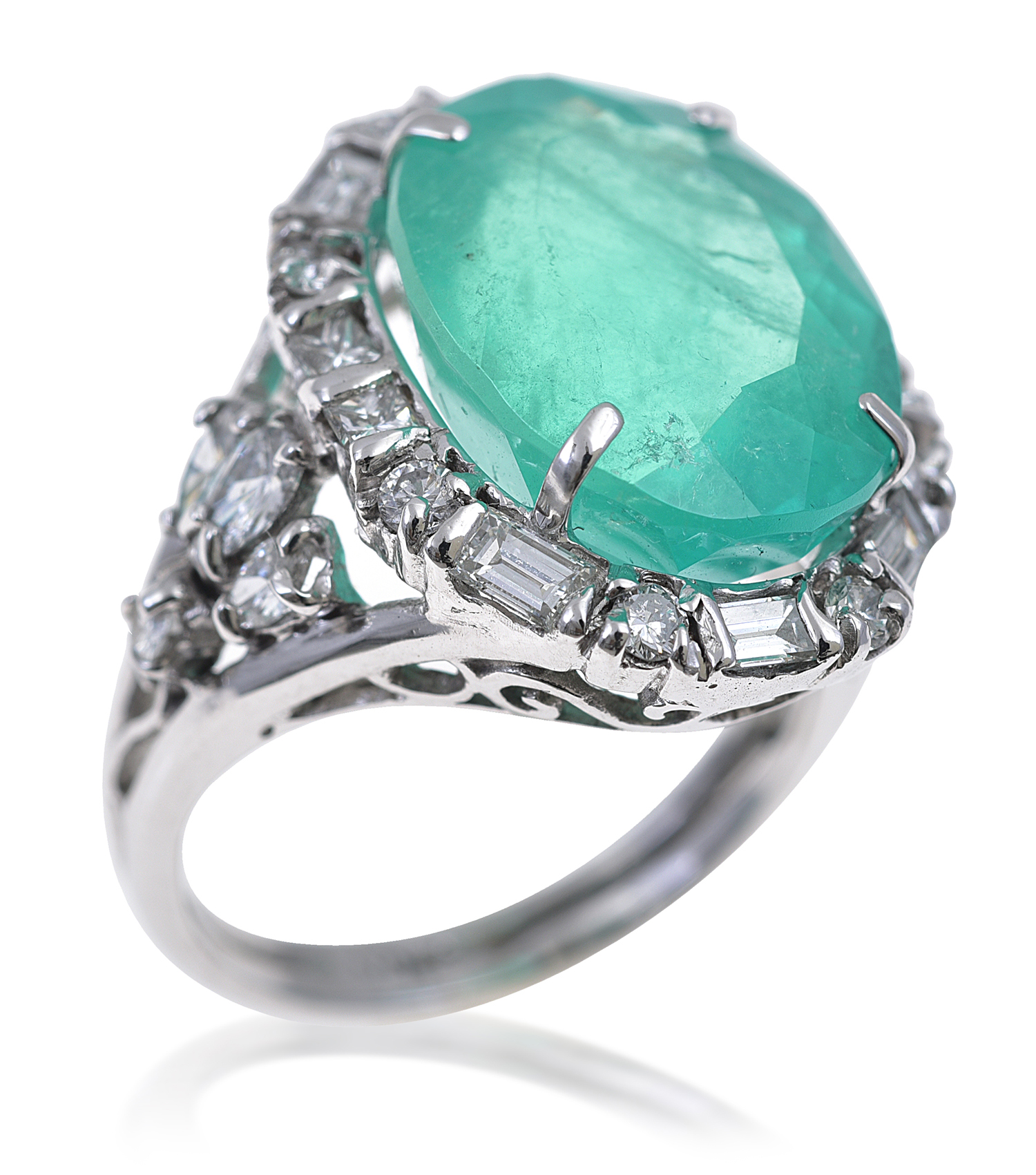 The oval cut emerald of 10.20cts having mixed cut diamonds set to the surround and shoulders totalling 1.24cts, mounted in 18ct white gold, ring size M-N.