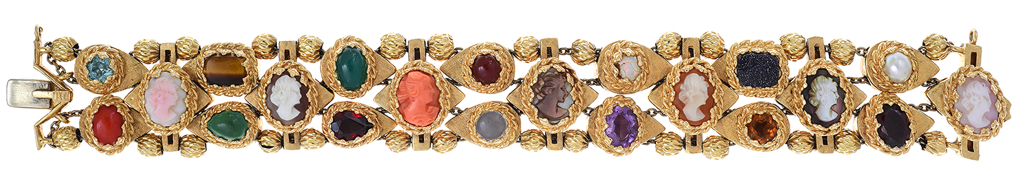 Comprising seven various cameos surrounded by semi-precious stones, mounted in 14ct gold, total length 185mm.