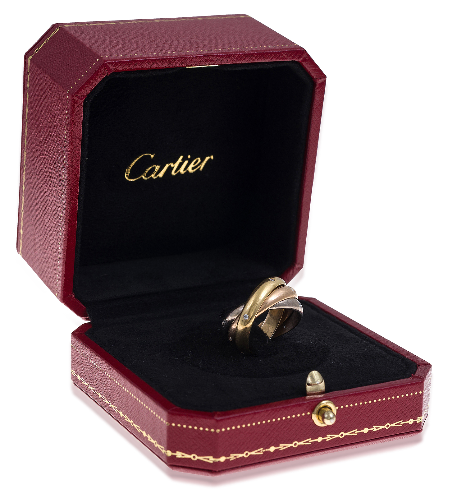 The Trinity ring with diamond detail, modelled in 18ct tri-coloured gold, signed, reference PO7435, ring size L, boxed.
