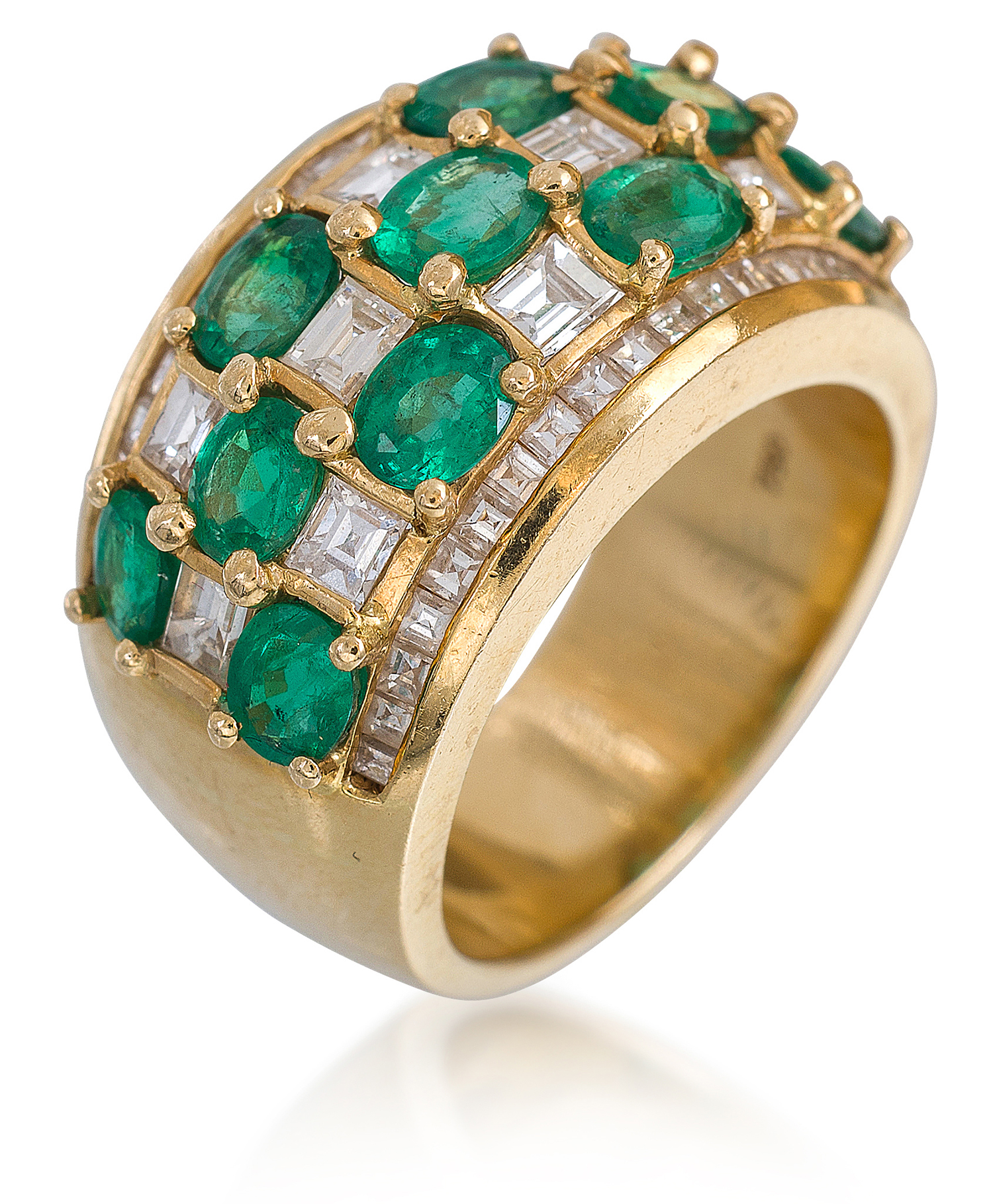 Comprising a bracelet, ring and pair of earrings, each piece set with oval cut emeralds and princess cut diamonds in a chequerboard formation, finished with a border of smaller diamonds, all mounted in 18ct gold, ring size M.
