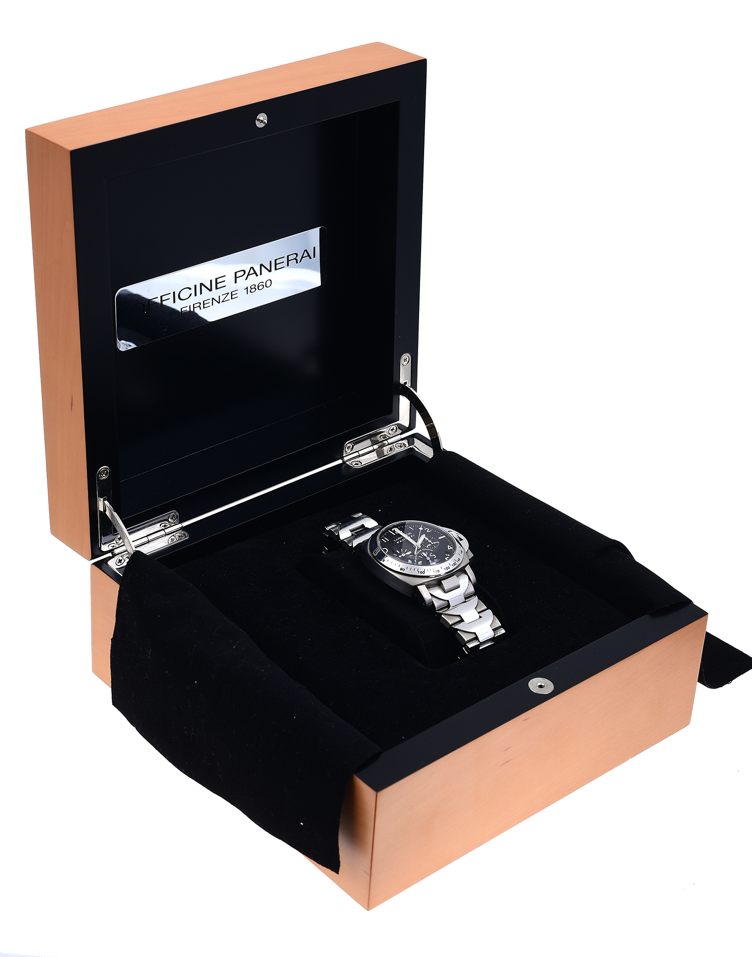 Automatic movement, circular black dial with illuminated numerals, three subsidiary dials and date at four, calibre 400Z, titanium case and titanium and stainless steel bands, presented with box, papers and leather bands.
