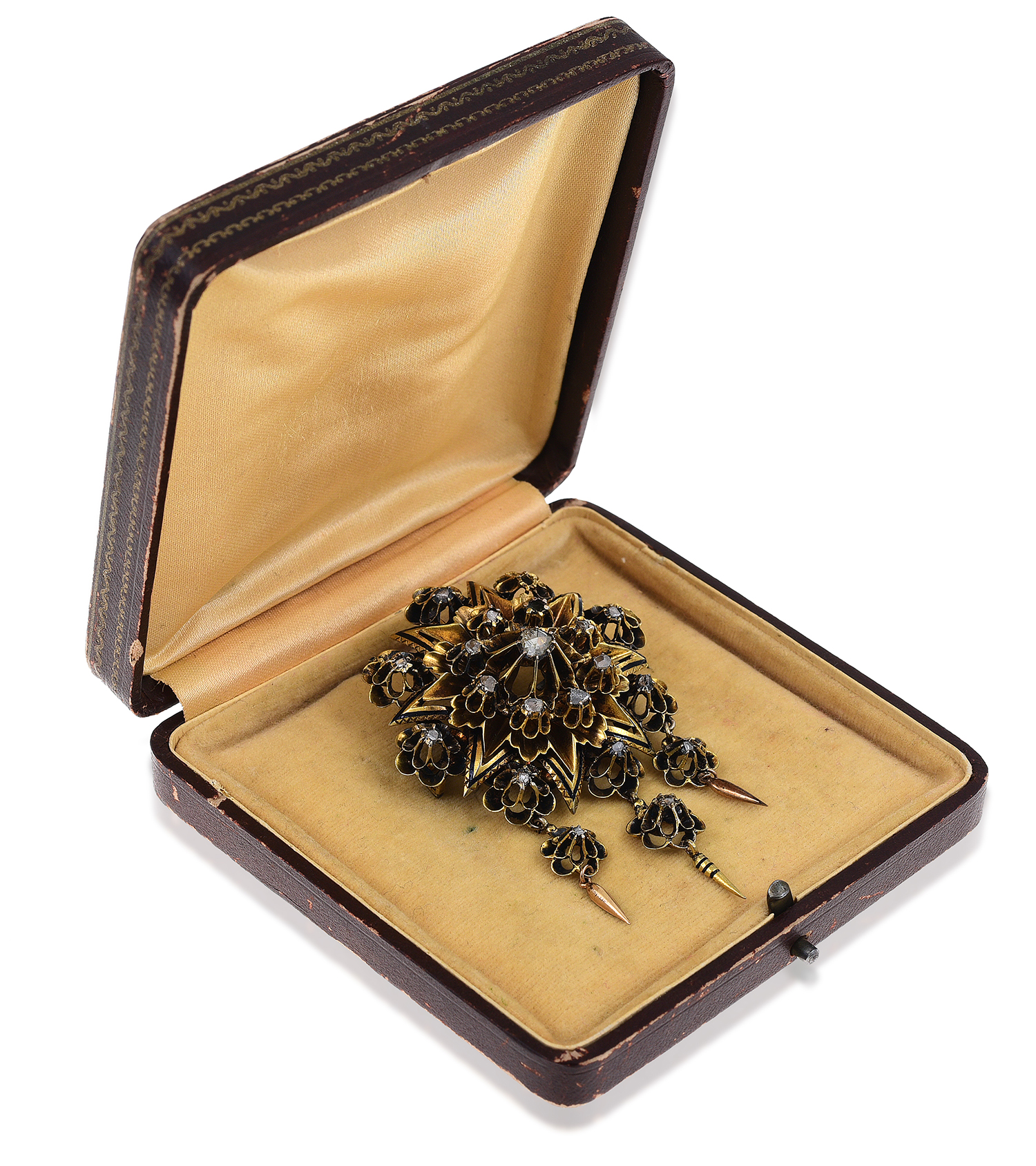 The starburst panel with flower cluster embellishment and tassel drops set with rose cut diamonds and highlighted with black enamel, mounted in 18ct gold.