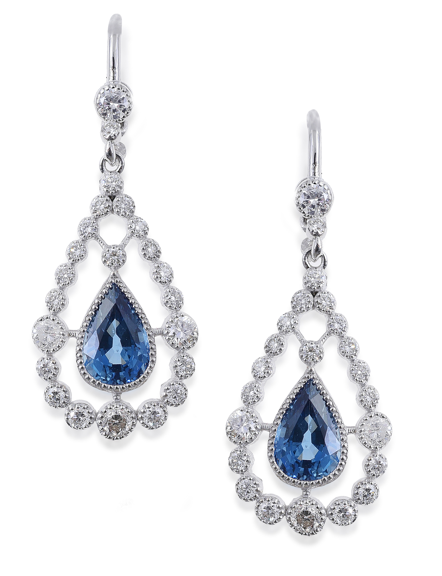 The ring featuring an oval cut sapphire of 1.45cts, surrounded by grain set round brilliant cut diamonds, the earrings of conforming design set with a pear cut sapphire and grain set diamonds, all mounted in 18ct white gold, ring size N.