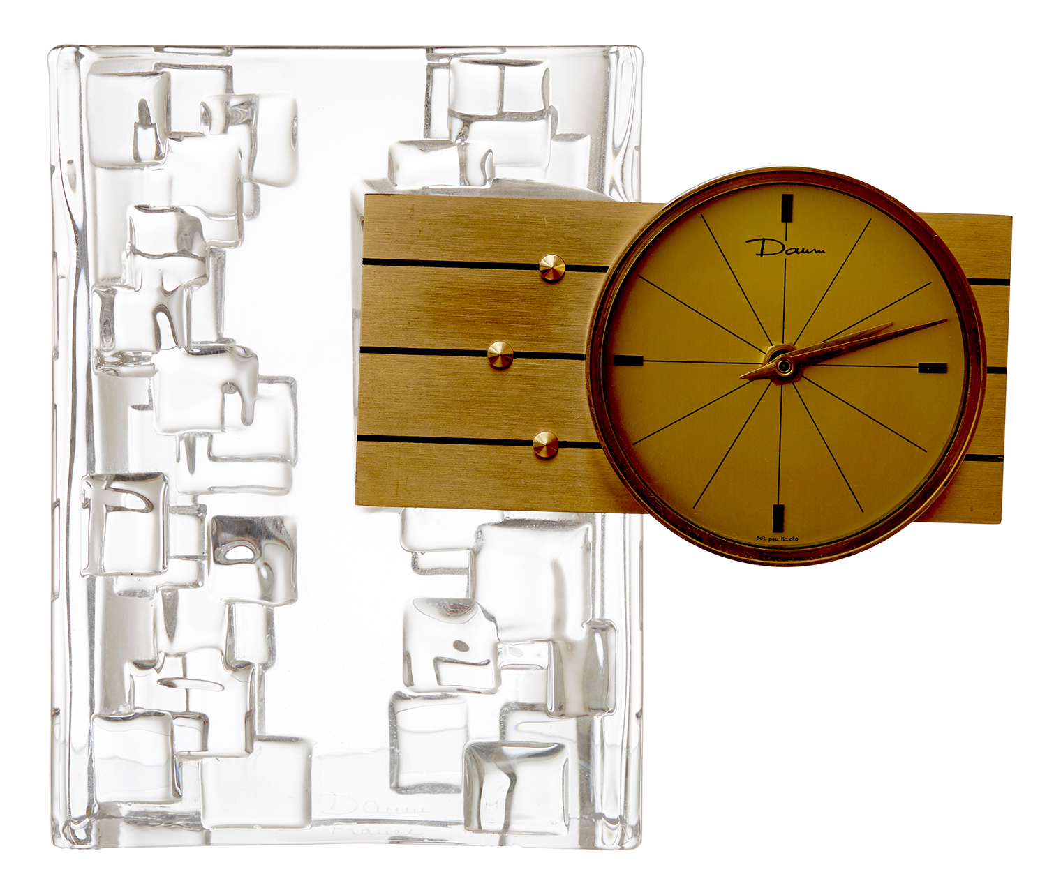 Each with concentric geometric design, clock face marked Daum and each signed in glass, clock 20cm high, vase 19cm width