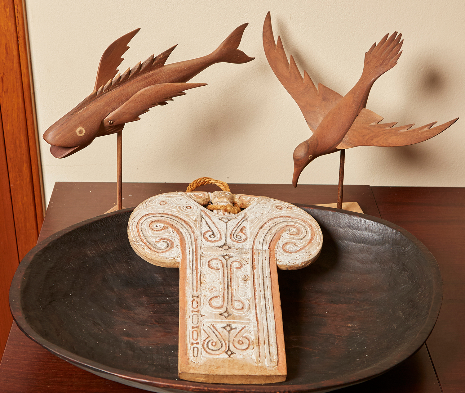 two Pitcairn Island carvings of a fish (28 cm height) and a bird (28cm height)