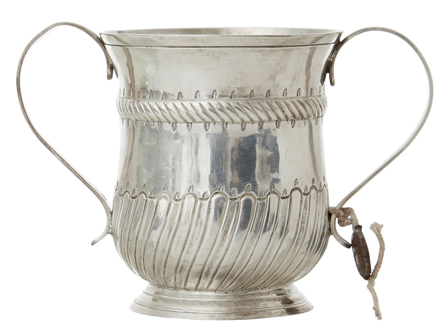 With embossed ribbed band and scrolling cartouche with initials CCM, old Antique Dealers Association button, 265 grams, 11.5cm high