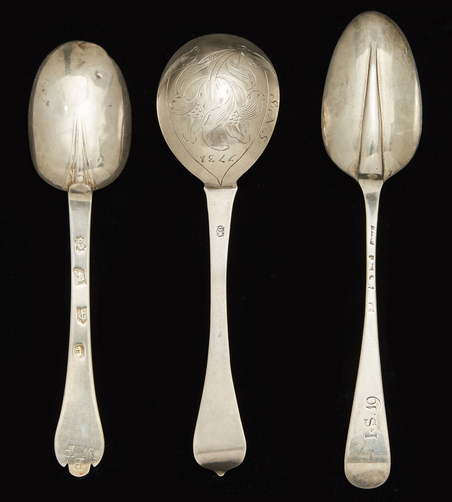 Comprising; Dublin silver trefid with rattail circa 1680-1719, provincial silver spoon circa 1730 marks rubbed maker WO and London rattail spoon circa 1719, (3)