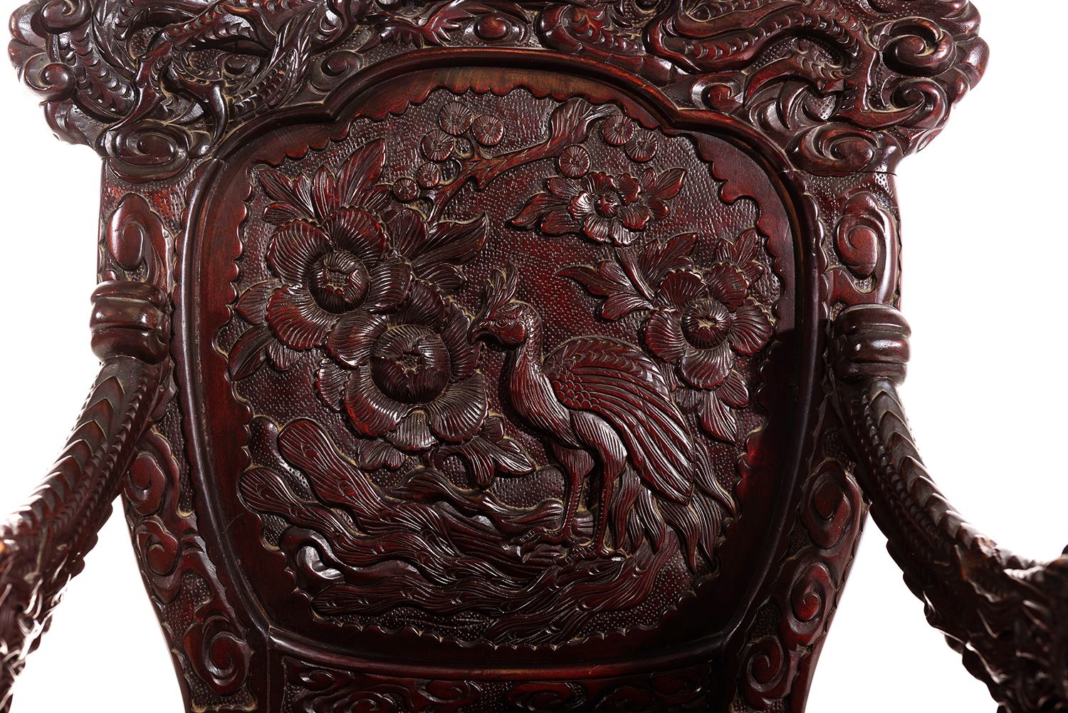 the elaborately carved back depicting a peacock scene bordered by entwined dragons, flanked by dragon shaped arm rests, 120 x 56 x 45cm