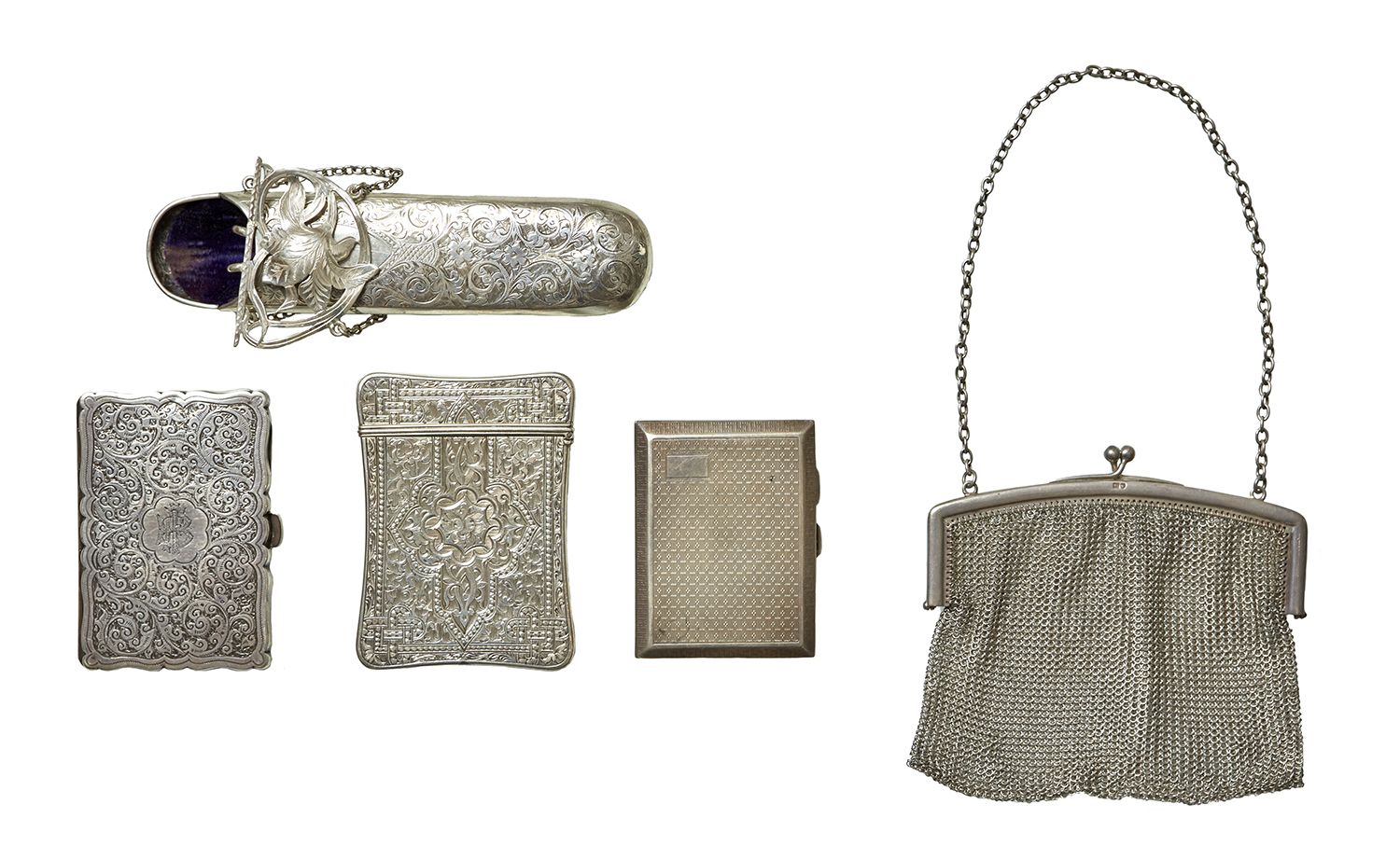 Comprising silver lorgnette case by Thomas Hayes, Birmingham 1902, card case by Robert Thornton Birmingham 1866, note book by William Neale, Chester 1896, card case by Alexander Clark, Birmingham 1904 and purse by British Automatic Mesh Company 1915, total weight 457 grams (5)