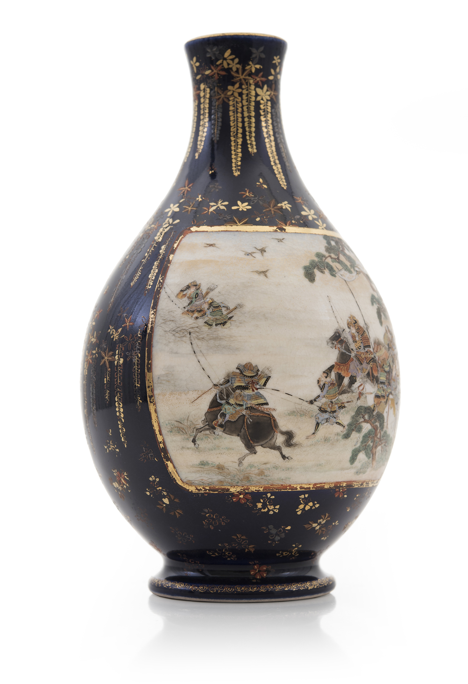A SATSUMA BOTTLE VASE, BLUE GROUND, WISTERIA DECORATION, SIGNED KINKOZAN, MEIJI PERIOD (1868-1912)