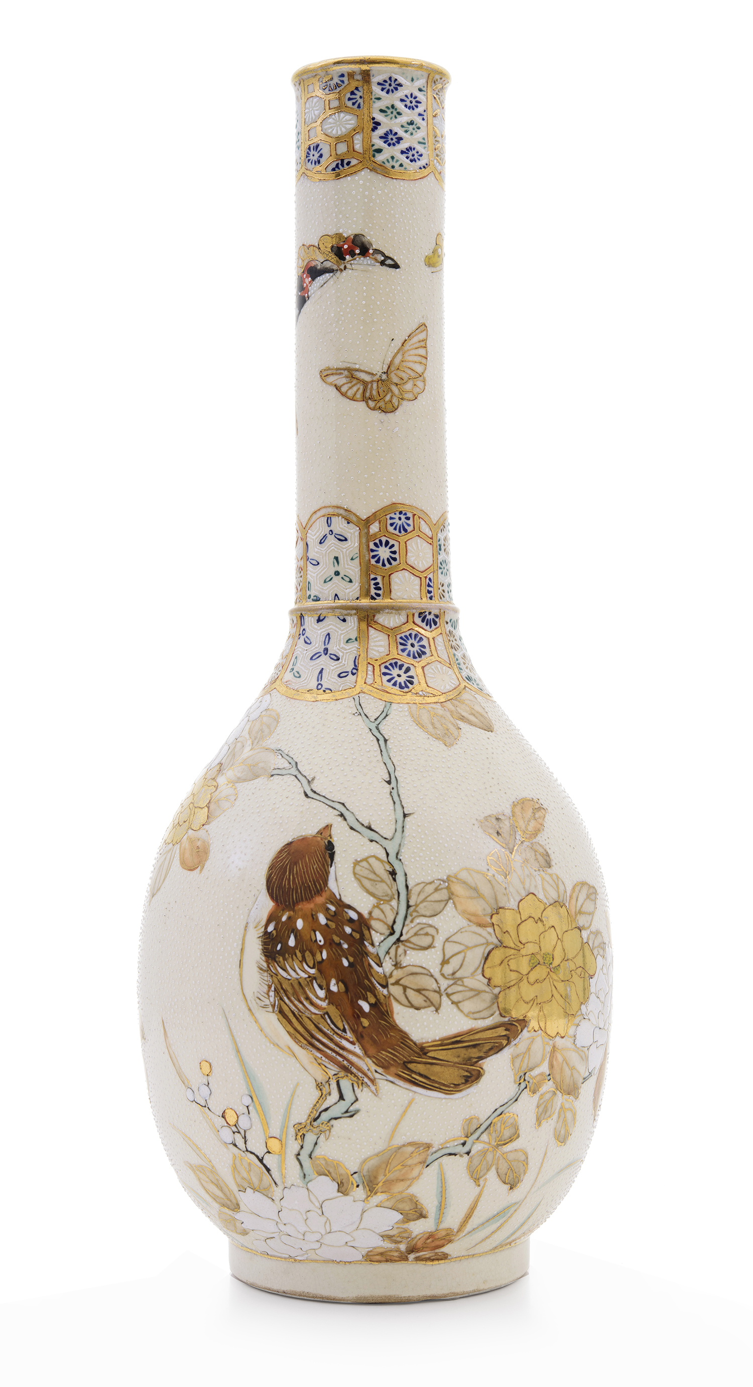 Comprising a baluster vase with dragon handles and a moriage decorated bottle vase, 31cm & 25cm high respectively