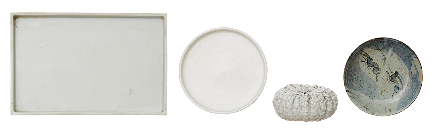 Including a ceramic pumpkin, unsigned, an underglaze painted rabbit theme dish, impressed mark to underside, together with a pair of white glazed dishes, one with impressed Tora to underside, the square dish 24 x 27cm (4)