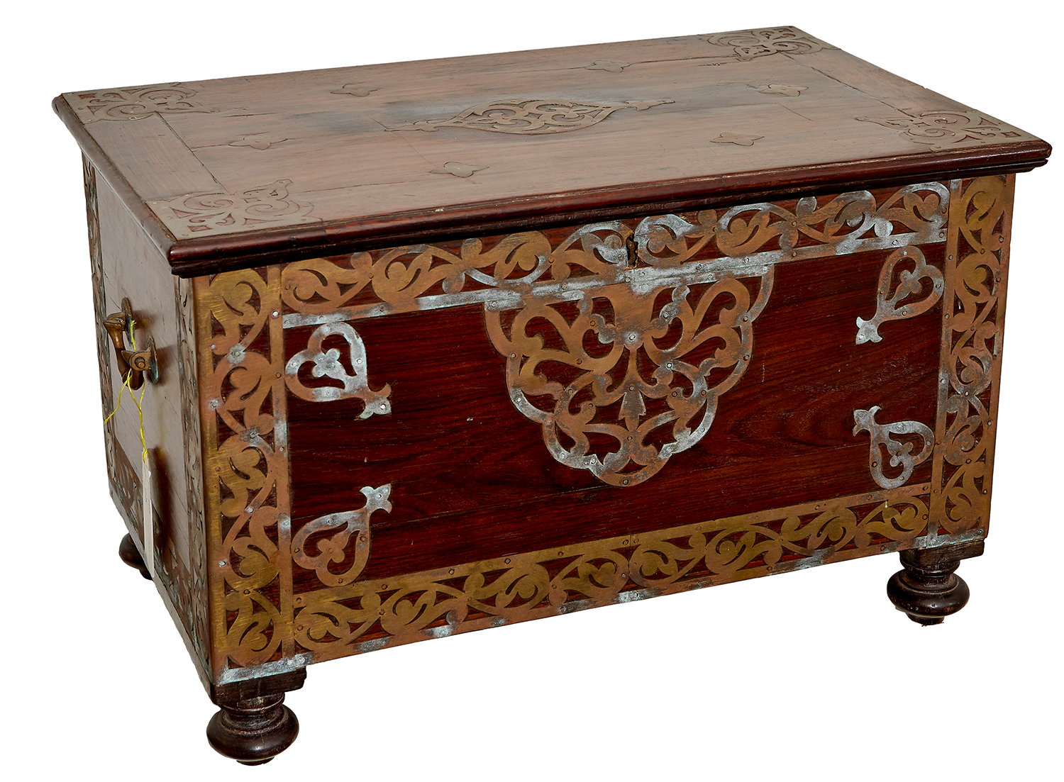 With scrolling brass mounts and swing carry handles, on turned feet, 50 width x 50 depth x 49cm height