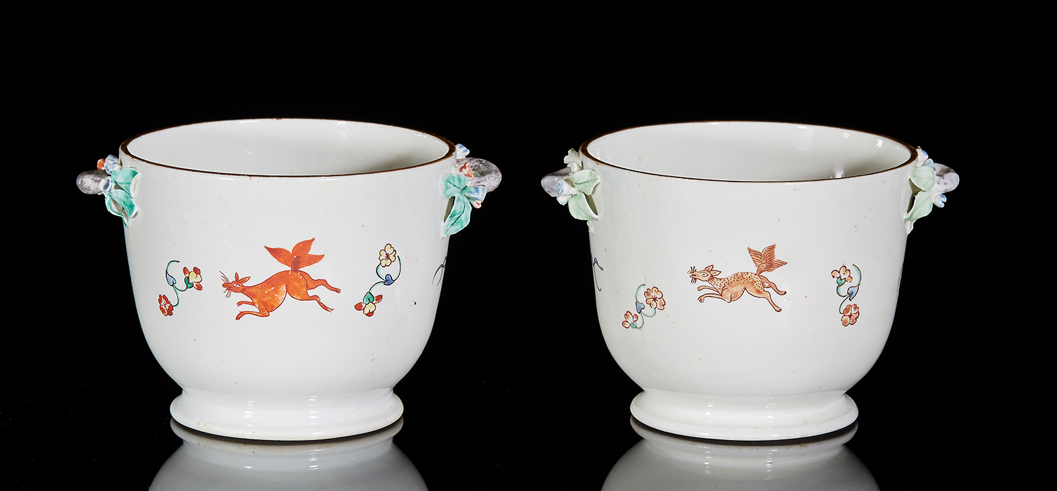 Of typical form with branch and leaf handles, each painted with squirrel and kakiemon flowers, red hunting horn mark on one, 9.5cm high, (2)
